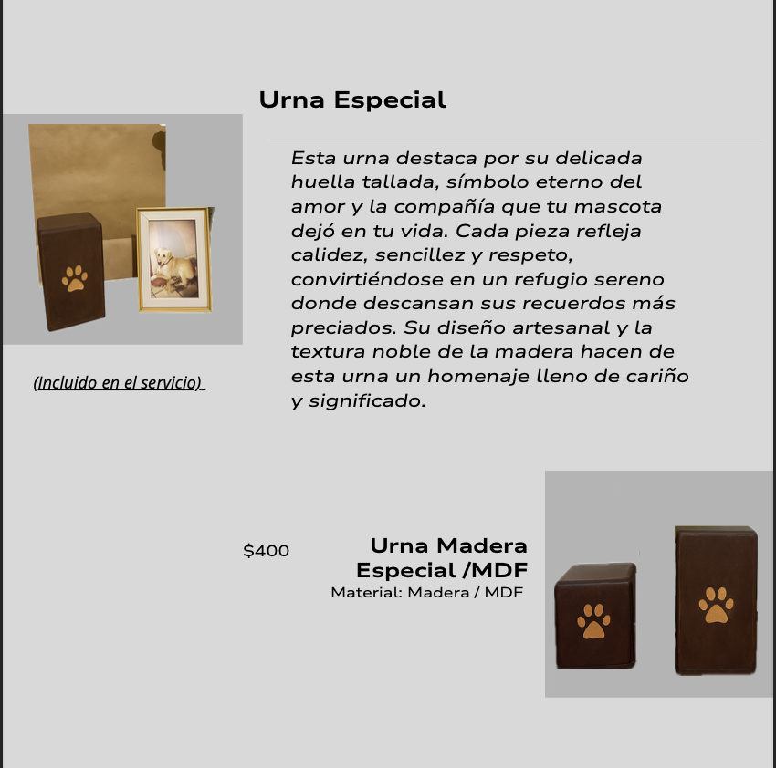 Ofrecemos la Urna Especial incluida el servicio para honrar la memoria de tu querida mascota con dignidad.